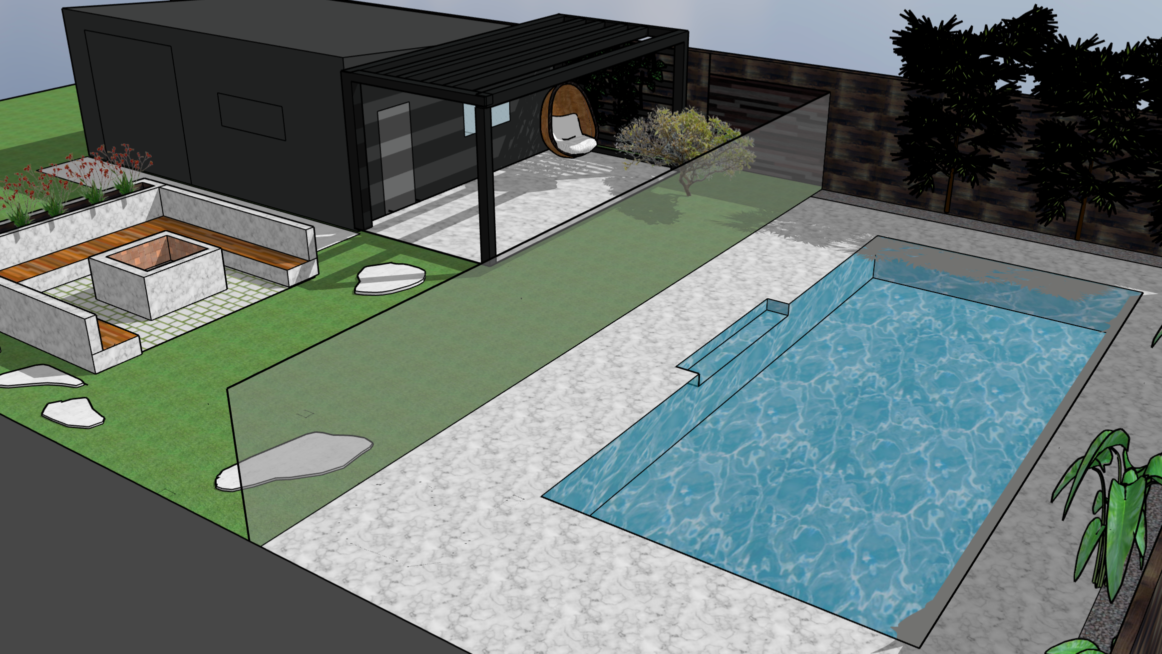 Framed in limestone paving and glass fencing, the design feels grounded and cohesive, with soft tonal variation adding warmth and texture underfoot. The pool’s clean form is complemented by a dedicated fire pit and seating area, creating balance between water and flame — a space designed for long afternoons, lively evenings and effortless outdoor entertaining.